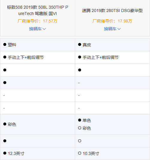 对比的两车车型分别是508L的车型为2019款 350THP 手自一体 驾趣版 国Ⅵ,速腾则是2019款 280TSI 双离合 豪华版。在配置方面,两车都有的配置为:可开启全景天窗、驾驶位电动调节、自动空调、自动头灯、CarPlay/CarLife、前后中央扶手、无钥匙启动、定速巡航、疲劳驾驶提醒、胎压监测等。