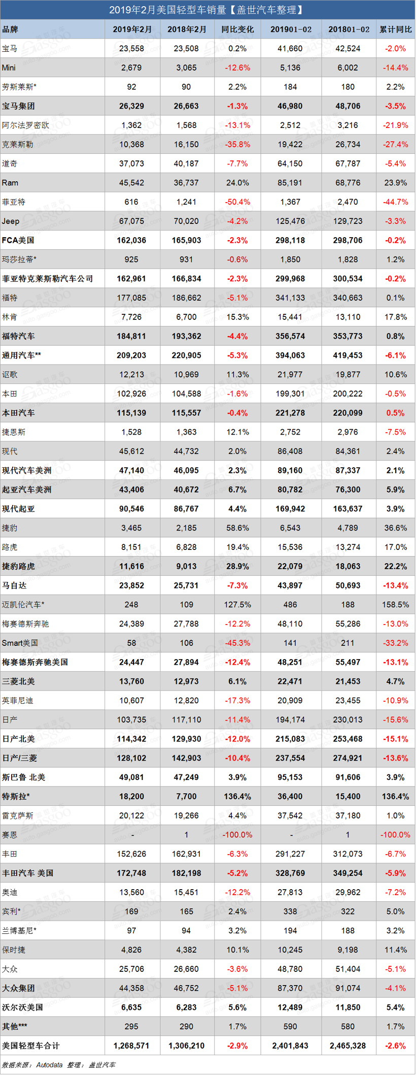 根据《美国汽车新闻》的报道,由于冬日寒冷天气、美国政府停摆的影响以及消费者对联邦退税的担忧,2019年2月份,美国轻型车销量同比下滑2.9%至1,288,571辆。